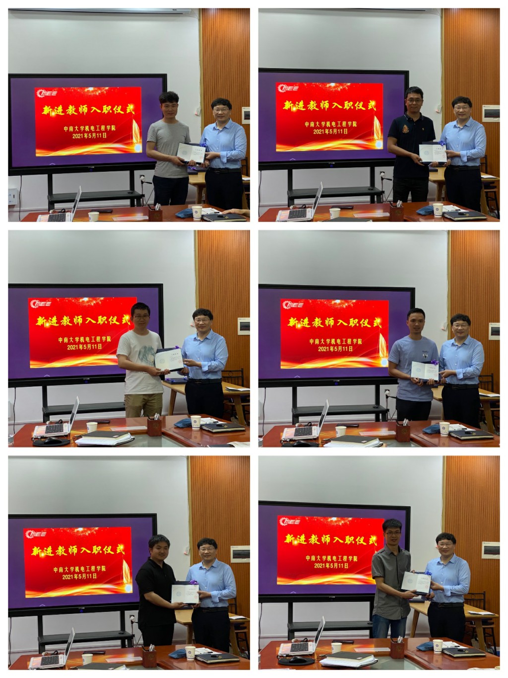 随后,院长段吉安亲手为每位新进教师颁发特制的入职证书并赠送纪念品,对新进教师入职中南、加入机电院表示欢迎和祝贺。
