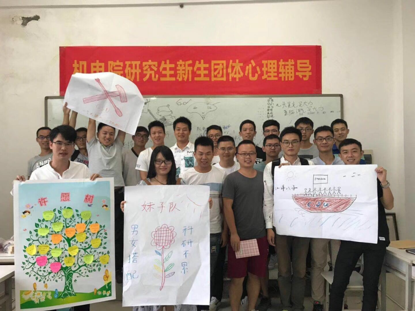 为了帮助2017级研究生新生尽快适应研究生生活,早日熟悉班级同学,促进同学们之间的交流,增强集体归属感,机电院研究生朋辈心理互助队积极组织了本次研究生团体心理辅导系列活动,并做好团辅老师们的助手。活动邀请到北大心理学硕士谭鑫老师;研究生辅导员、国家二级心理咨询师何婷老师;国家二级心理咨询师肖楚楚老师;国家三级心理咨询员江俊鑫老师;国家三级心理咨询员石越老师等五位老师。此次团体心理辅导系列活动于2017年9月20日至26日在机电楼C座505、506、508、B-C座大厅分别展开,以班级形式先后进行了7场,2017级240余名研究生参加了本次团体心理辅导活动。