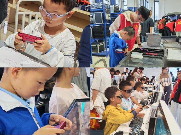紧接着,小朋友们来到机器人实验室,参加格斗机器人体验环节。两台精密机器人一亮相便吸引了孩子们的目光,志愿者先进行紧张激烈的演示对战,他们操控的机器人能够灵活移动、闪避,发出的碰撞声引得孩子们阵阵欢呼。演示结束后,小朋友们在志愿者的指导下亲手操作机器人小车。他们围在小竞技场旁,专注盯着自己控制的机器人,感受机械与智能控制的魅力,一颗颗探索科技奥秘的梦想种子在此刻悄然萌发。
