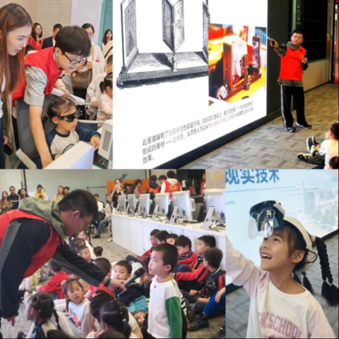 活动伊始,志愿者赵炬以生动的幻灯片讲解为小朋友们科普元宇宙概念,在场孩子在前排专注聆听。讲解后,赵炬暂停演示,鼓励孩子们提问并耐心解答,让知识学习从被动接受转为主动探索。随后,在VR设备体验环节,小朋友们在志愿者的引导下分组佩戴VR设备,兴奋地张开双臂,感受虚拟世界的魅力。